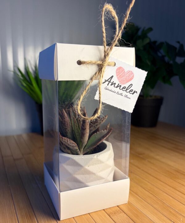 (BA4)-Anneler Günü Özel Beyaz Asetat Kutulu+Beton(4) Saksılı Hediyelik Sukulent
