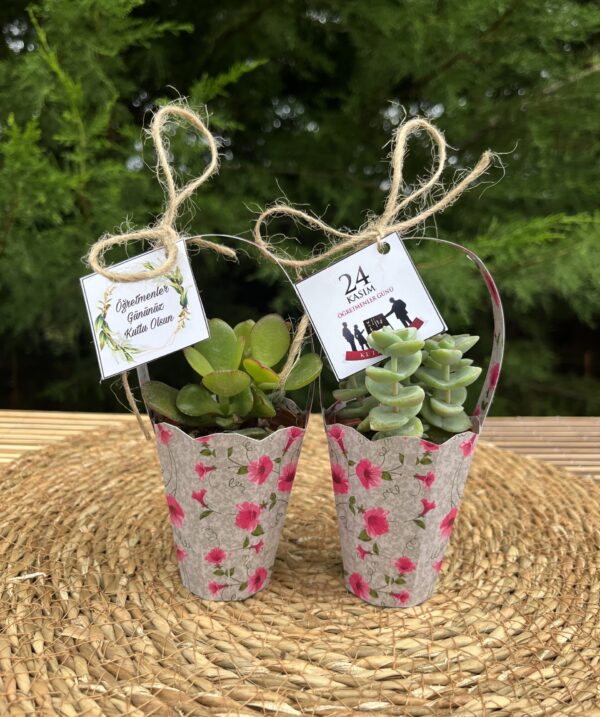 Öğretmenler Günü Özel Yuvarlak Çanta Süslemeli Sukulent (Çiçek Desenli)