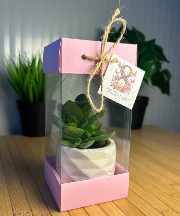 (PA4)-Kadınlar Günü Özel Pembe Asetat Kutulu+Beton(4) Saksılı Hediyelik Sukulent